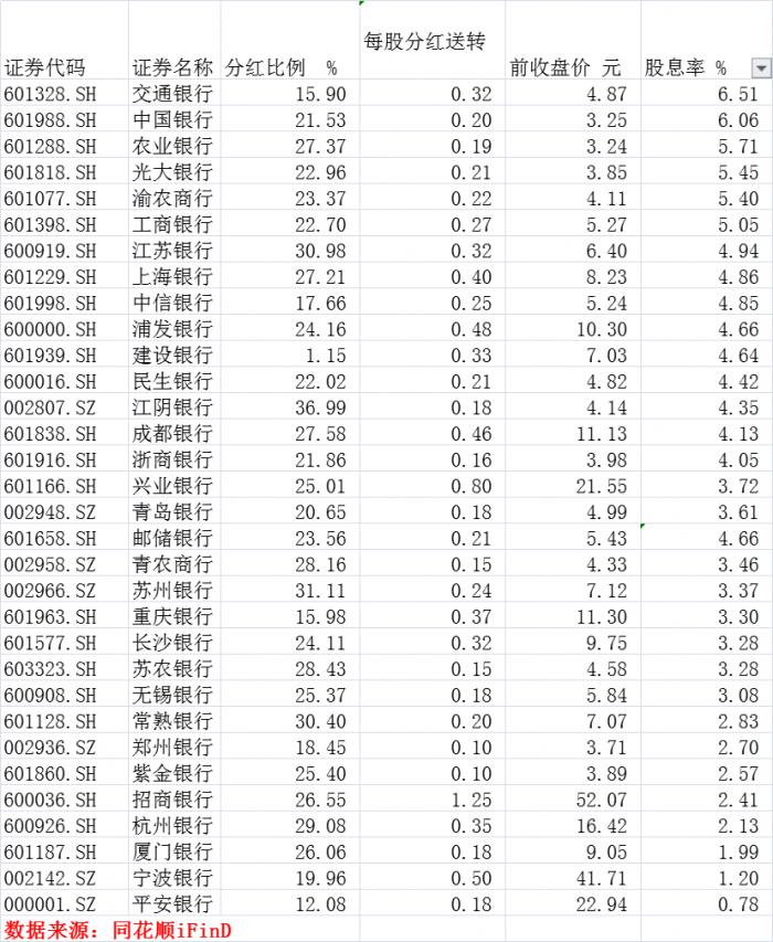从股息率来看, 已披露年报的银行中,有两家上市银行的股息超过6%,分别是交通银行和中国银行,根据28日的收盘价计算,交通银行的股息率已经达到6.51%,中国银行的股息率达到6.06%,秒杀多数银行理财产品的收益率。