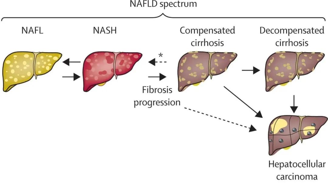 ▲NAFLD的疾病谱:NAFL – NASH - 代偿期肝硬化 - 失代偿期肝硬化。NASH和肝硬化可进展为肝细胞癌。*纤维化消退。(图片来源:参考资料[1])