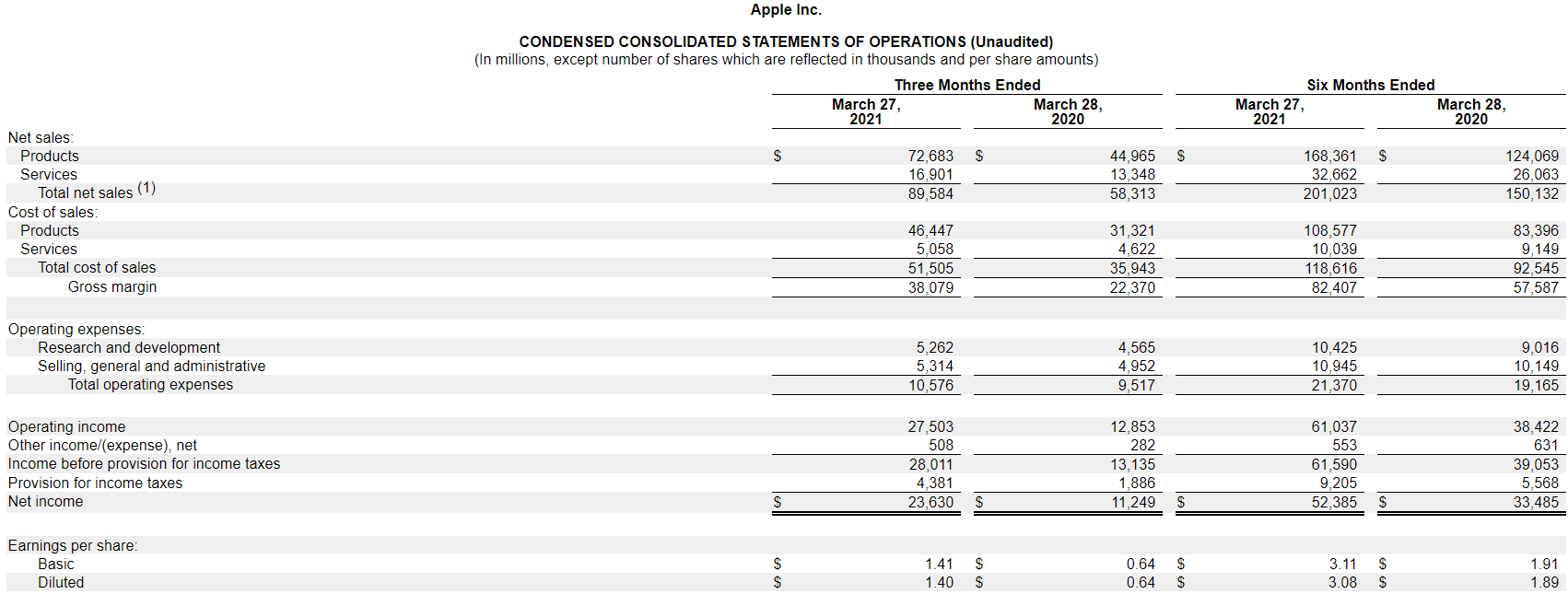 第二财季,苹果总收入为895.84亿美元,较前一年同期的583.13亿美元同比增长54%;毛利润为380.79亿美元,较前一年同期的223.7亿美元同比增长70%;净利润为236.3亿美元,较前一年同期的112.49亿美元同比增长110%;基本每股收益为1.41美元,摊薄后每股收益为1.4美元。