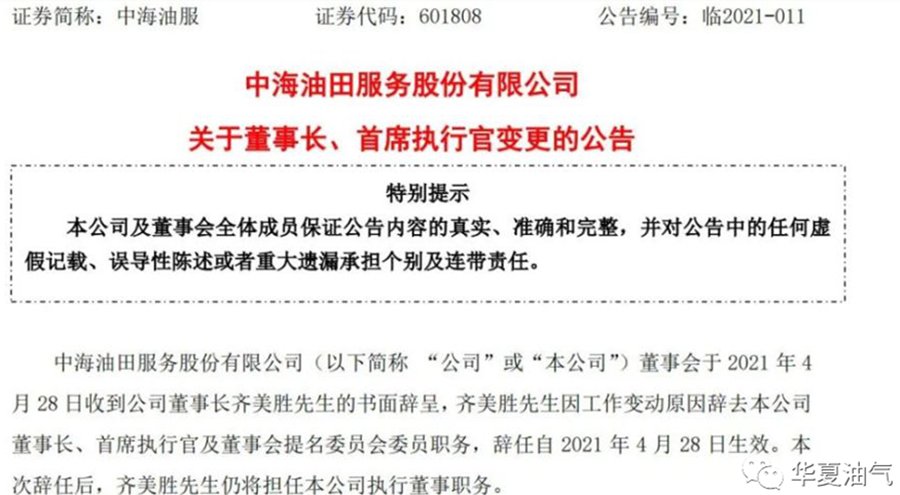 华夏能源网(www.hxny.com)获悉,4月29日,中海油田服务股份有限公司(简称“COSL”)发布公告:齐美胜因工作变动原因,辞去公司董事长、首席执行官及董事会提名委员会委员职务。选举赵顺强为公司董事长,聘任其为公司首席执行官,并同意其担任董事会提名委员会委员职务。