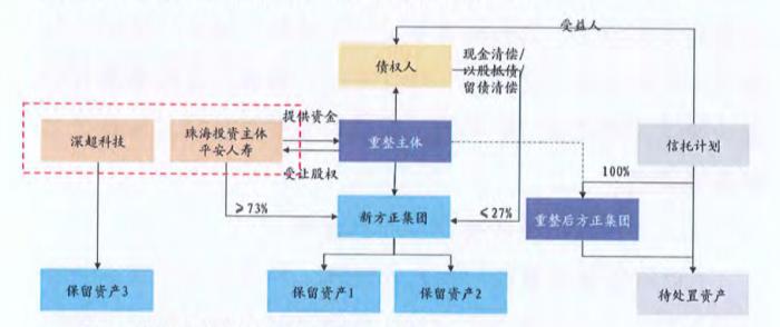 根据债权人对清偿方案的选择情况,投入总额约537.25亿元-733.00亿元的资金用于偿债,有条件受让重整后新方正集团73%-100%股权及其他资产,并在符合法律法规的前提下,重整后持续为新方正集团提供资金、资源等多方面的支持。