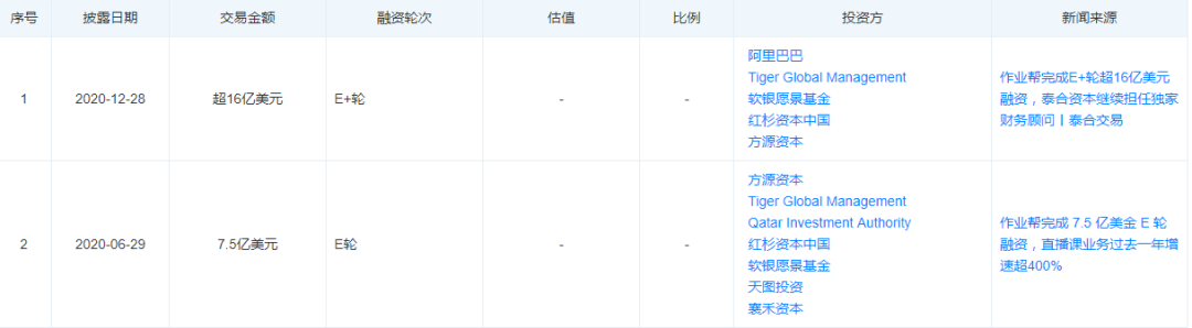 作业帮也在2020年拿下了2轮融资,融了23.5亿美元,估值96亿美元: