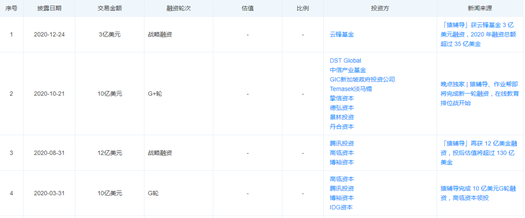 先看猿辅导,其在2020年一举拿下4轮融资,融了35亿美元,估值达到170亿美元,一跃成为全球估值最高的在线教育独角兽: