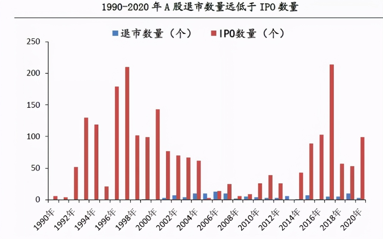 公开数据显示,从1990年至2020年,A股退市数量远远低于IPO数据。国外则相反,有些国家股市的退市数量累计值超过了IPO的数量。对于A股退市率过低,外界有多个说法,包括IPO机制的僵化和高门槛。有分析人士表示,A股退市率低是因为一些A股公司通过资产重组、财务操纵等方式保壳。