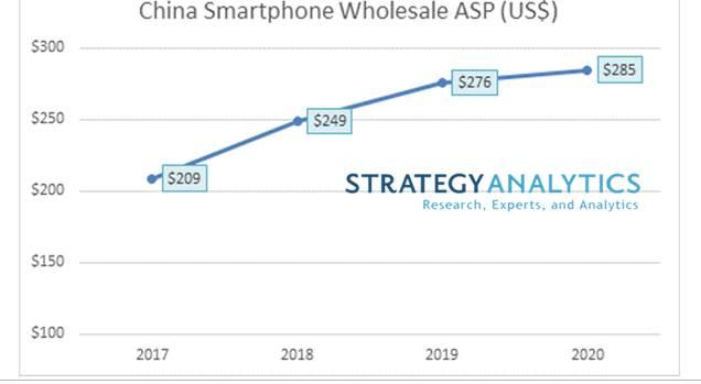 (2017-2020年中国智能手机批发价格趋势图,来源:Strategy Analystics)