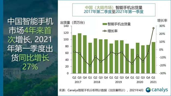 (2021年Q1中国智能机整体出货趋势,来源:Canalys)