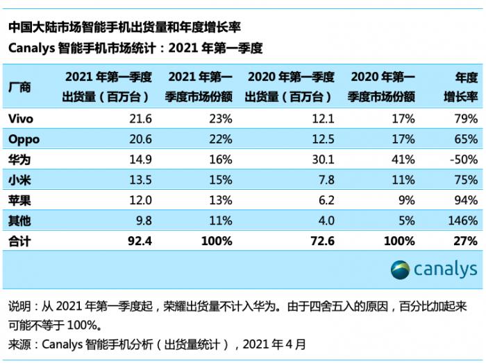 (2021年Q1中国市场手机品牌出货量排名,来源:Canalys)