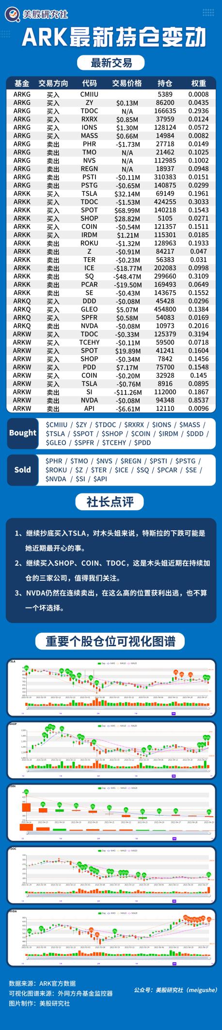 由于ARK基金管理的ETF的业绩非常出色,ARK会公布每日持仓动作。4月30日,美股研究社整理该基金持仓动作如下: