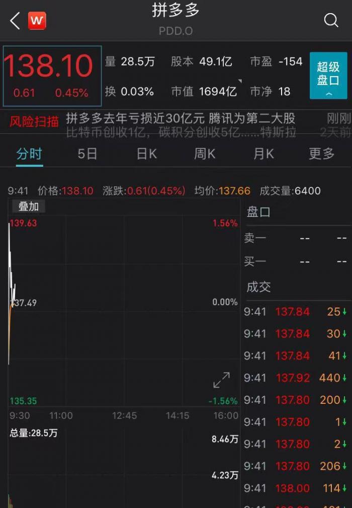 北京时间4月30日晚间,拼多多开盘跌1.5%,不过截至21:41,拼多多已由跌转涨,涨幅0.45%。此前拼多多公布财报显示,去年亏损近30亿元人民币。