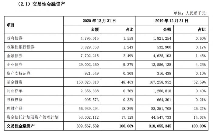 从上述数据可计算,北京银行持有基金及其他占比为82.09%,上海银行占比为48.46%;占比次高的为金融机构债券,占比为6.4%,而上海银行占比为2.49%;同时上海银行持有理财产品、资金信托计划及资产管理计划占比仍高达18.39%、17.12%。