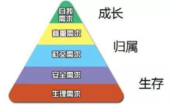 美国心理学家亚伯拉罕·马斯洛将人类需求从低到高分为五个层次,分别是生理需求、安全需求、社交需求、尊重需求和自我实现需求,这是一个从基本物质满足向精神需求满足升级的金字塔结构。