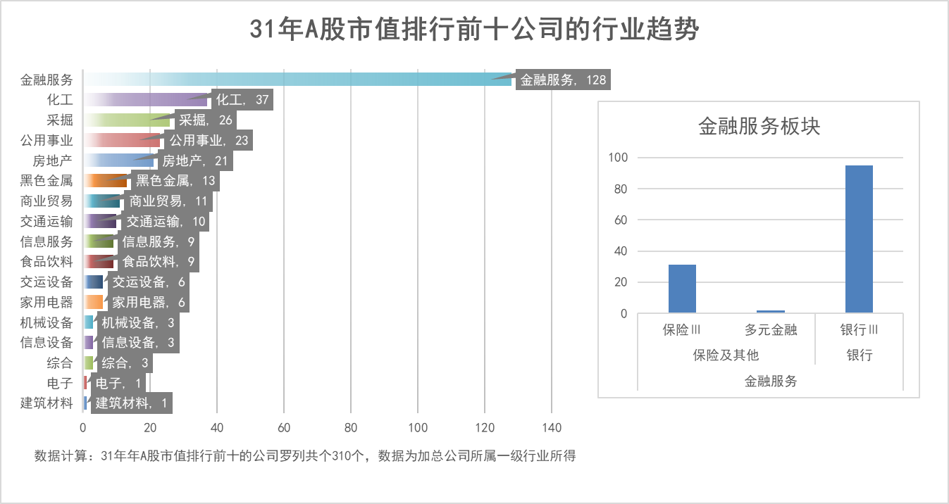 其中,金融服务的迅猛发展尤其引人注目。在31年中,排行前十的公司,根据年份和公司计数,总和为310。其中金融服务计数为128,占到了总计数的41.29%,占比接近一半。在金融服务中,银行占比最大,达到了金融服务计数的3/4。其中在2021年4月28日统计的数据中,A股公司市值排行前十的公司,包括工商银行、建设银行、招商银行、农业银行、中国银行五家银行和中国平安、中国人寿两家保险公司,占据了市值排行前十的多数席位。