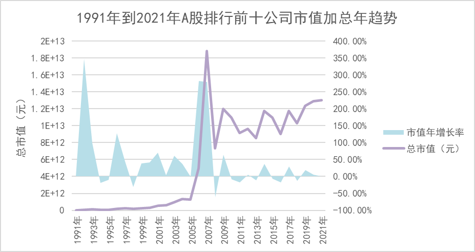 1991年,A股排行前十的公司总市值为11,326,607,167.90元人民币,截至2021年4月28日,排行前十的公司总市值达到1991年总市值的1150.53倍。30年,A股排名前十的公司市值从1991年以百亿计量,到2021年以十兆计量,三十一年股市市值的指数级增长,是中国大型企业的成长之路,也是中国在市场经济改革中迸发的巨大能量。其中,2007年A股排行前十的公司总市值达到了30年来的最高值,2008年金融危机爆发,市值降低了11.525千亿元。自2009年至今,股市逐渐趋于平稳,年增长率起伏稳定在50%以内的上下区间,近5年稳定在30%以内。