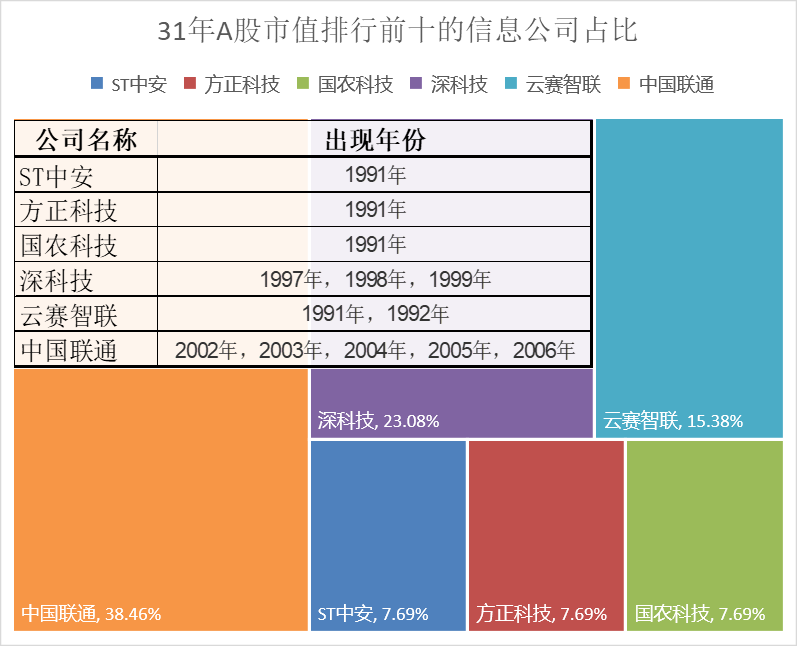 31年,A股市值排行前十的公司,信息类只有6家,共上榜13次