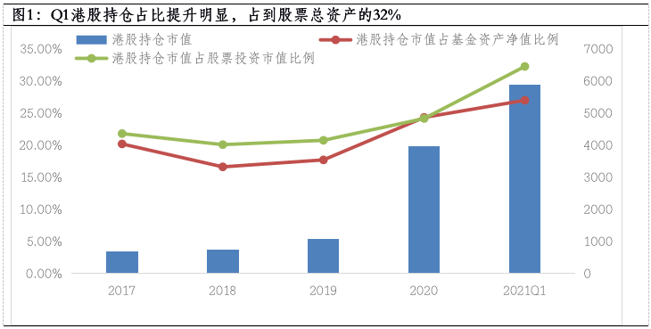 据1季报披露,仅计算A类份额,当前可投资港股的基金一共有917只,港股投资市值达到5848亿元。相较于去年四季度,数量上增加192只,规模上增加1885亿元,规模环比增长率达48%;从另一个维度看,港股投资市值占基金资产净值的26.88%,占股票资产的32.19%,较2020年底的24.22%和27.42%均有明显抬升。