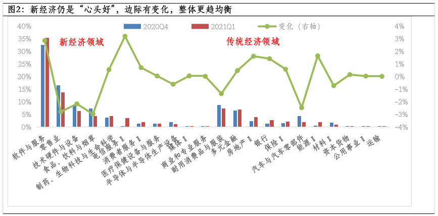 行业层面,从十大重仓股看,存量维度上,截至一季度,公募基金在港股市场上的行业配置方向依然以新经济为绝对主导,占比高达71.70%,但相比2020年底的72.95%有所回落;边际变化上,相较于去年年底,电信与软件服务增持最多,分别增加3.19%、2.84%,但与此同时,能源、房地产、银行等传统行业也得到一定幅度增持,分别增加1.63%、1.60%、1.41%;零售业和食品饮料减持最多,分别减持2.98%、2.80%,汽车与汽车零部件、技术硬件与设备减持幅度也在2个百分点以上。整体而言,行业层面呈现出更为均衡的态势。