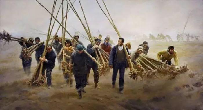 为塑造好这一形象,作者多次到兰考考察,最终以治沙这一历史场景作切入点。画面中,焦裕禄带领群众扛着树苗、顶着风沙走向沙荒,边走边和群众交流,突出了“党的好干部”带领人民治理风沙的形象,产生了强烈的视觉冲击力。农民、林业技术人员的神情和穿着打扮质朴生动,带有浓郁的地域特征和时代气息。