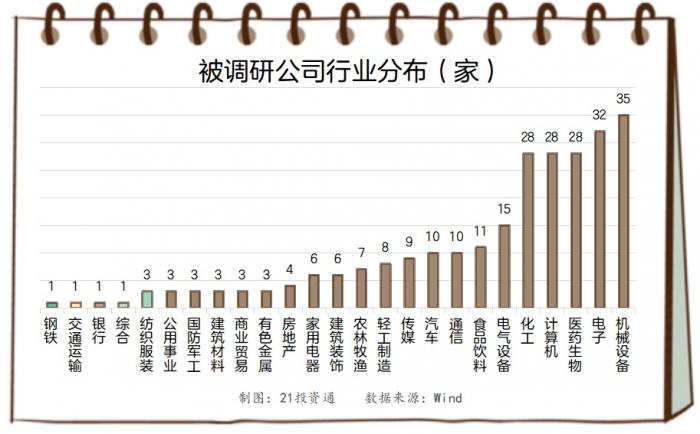 从行业分布来看,机械设备行业35家公司获得机构关注,电子行业紧随其后,亦有32家获得调研,医药生物、计算机、化工等均有28家公司获得青睐。