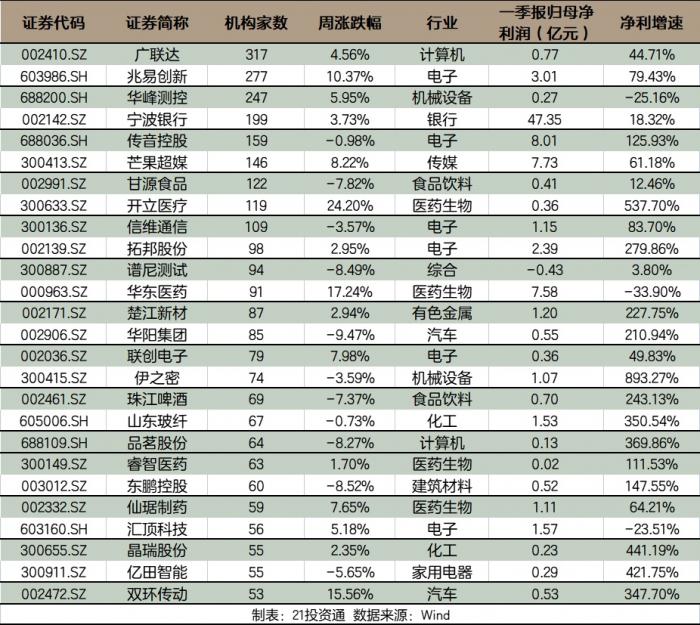 另外,时值一季报披露完毕,机构关注的重点也在各公司业绩表现,在一周获得超50家机构调研的26家公司中,仅谱尼测试(300887.SZ)出现亏损,14家公司一季报净利润增速在100%以上。伊之密(300415.SZ)净利增速达到893%。