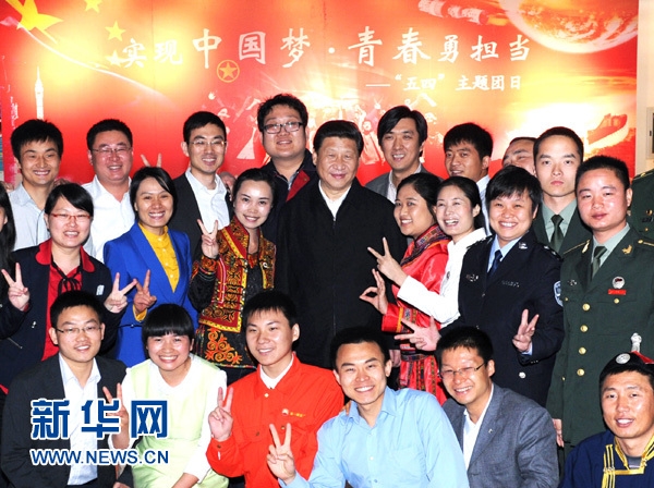 2013年5月4日,中共中央总书记、国家主席、中央军委主席习近平来到中国航天科技集团公司中国空间技术研究院,同各界优秀青年代表座谈并发表重要讲话。这是座谈会前,习近平和在展厅参观的优秀青年代表合影。新华社记者