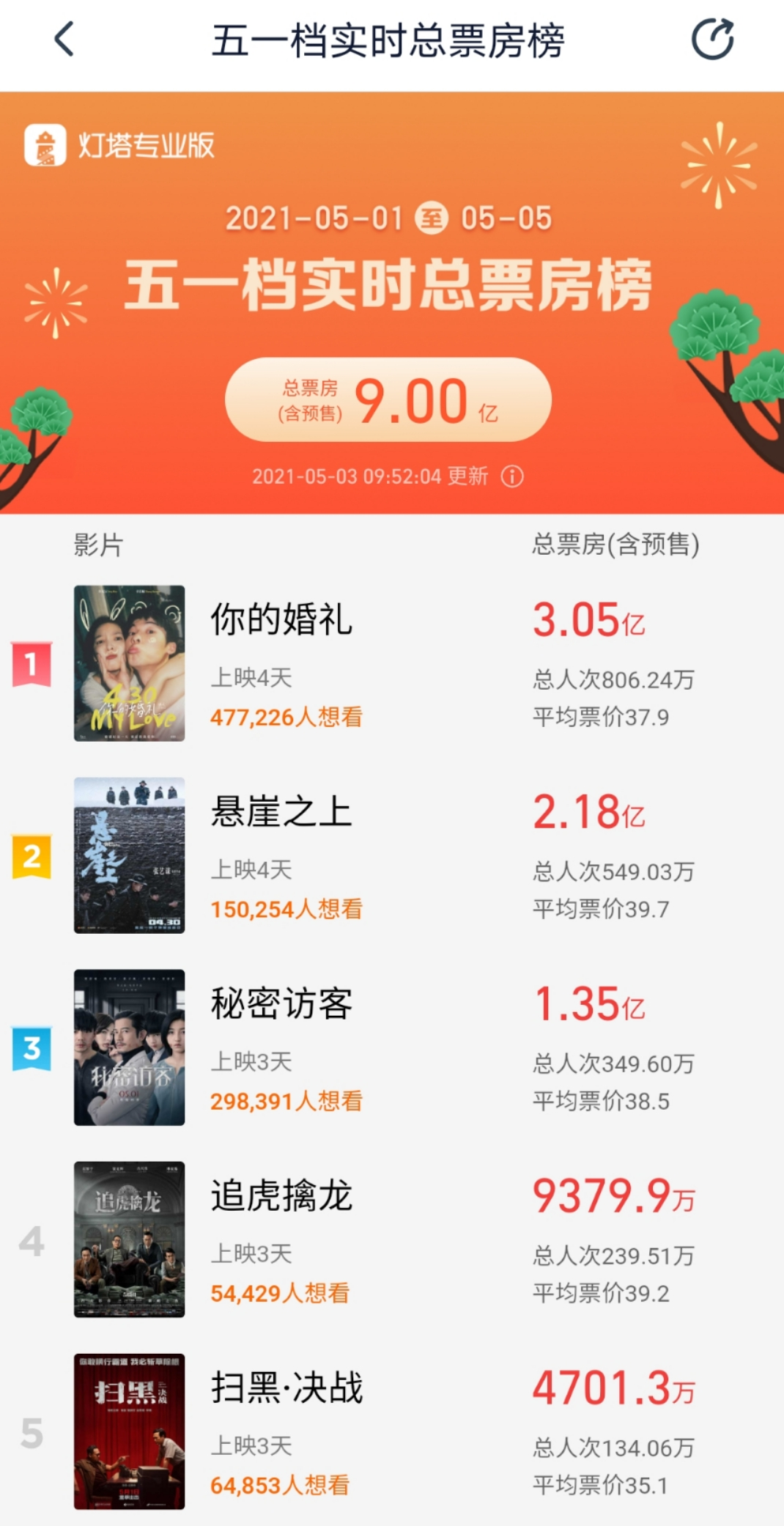 据灯塔专业版数据显示,截至2021年5月3日9时52分,五一档电影累计票房超9亿(含预售)。目前票房前三名分别是《你的婚礼》《悬崖之上》和《秘密访客》。