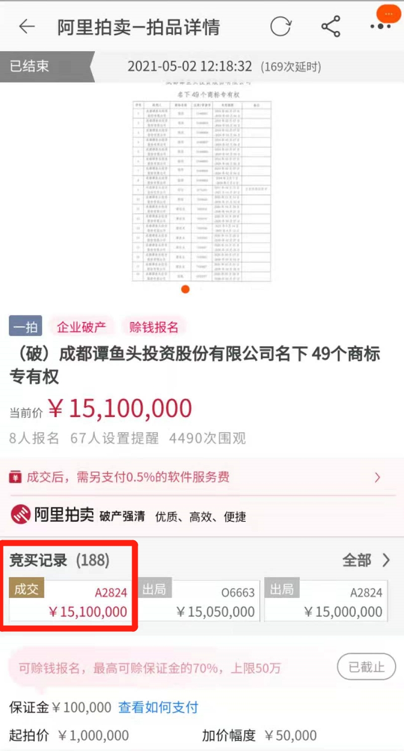 5月2日12点19分,经过188次竞价和169次延时,“谭鱼头”名下49个商标终于以1510元价格成交。因竞价过于激烈,原本上午10点就该结束的拍卖,169次延时至12时19分方结束。