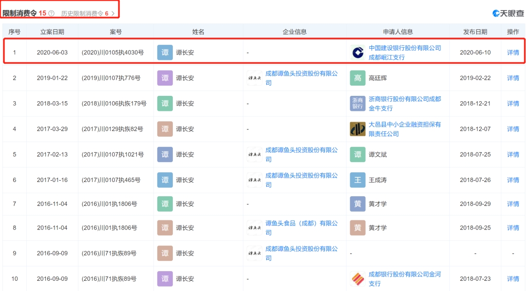 | 谭长安也多次被限制消费。最近的一次是2020年6月,由中国建设银行股份有限公司成都岷江支行申请。谭长安欠建行成都银行不到5万的金额。截至2018年3月27日,谭长安尚欠建行成都岷江支行借款本金44921.69元、利息2954.52元、罚息1126.94元。 |