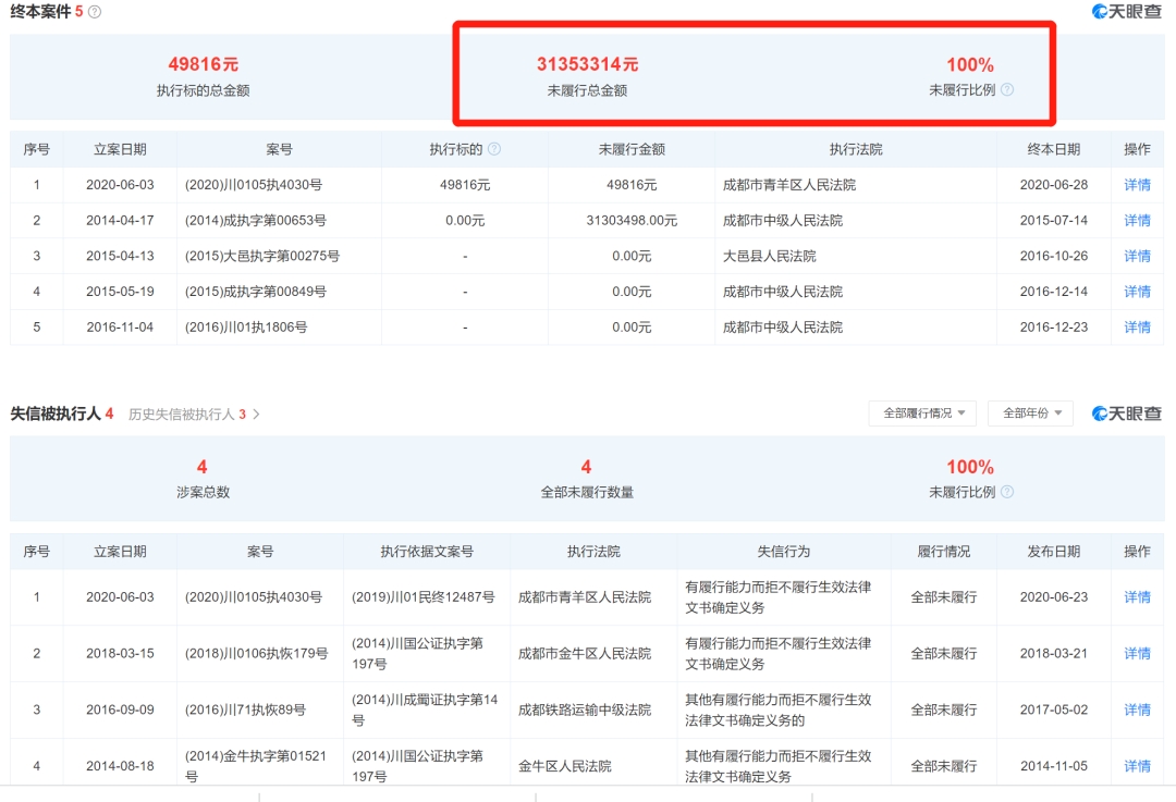 而如今,资料显示,谭长安因没有可执行财产,已有5起案件被暂时中止执行,而这5起案件的涉及金额超3100万元,未履行比例为100%。