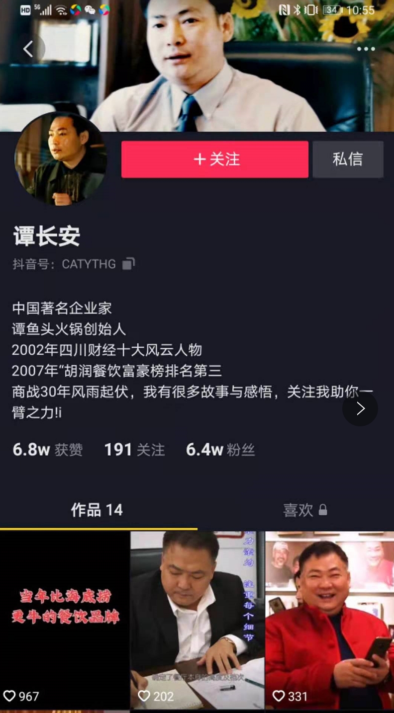 抖音显示,谭长安账号发布14个作品。他表示,商战30年风雨起伏,有很多故事和感悟,希望可以助力创业者。