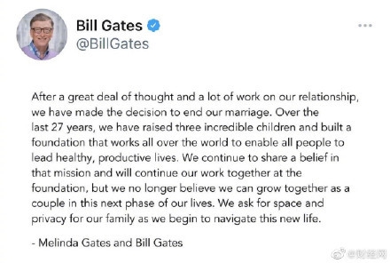 经过长时间的深思熟虑之后,我们决定结束我们的婚姻。在过去的27年时间里,我们养育了三个优秀的子女,建立了一个让全球受益的基金会。我们对这一使命抱有共同的信念,并将继续努力,但我们不再相信在我们下半生可以作为伴侣共同成长。当我们开始新的生活的时候,我们要求您尊重我们的隐私。落款则是比尔·盖茨和梅琳达·盖茨。