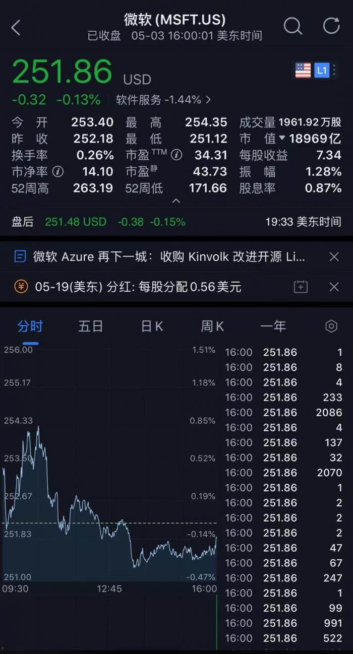 微软股价未出现明显波动,截至5月3日收盘,微软股价盘后报251.86美元,跌幅0.13%。
