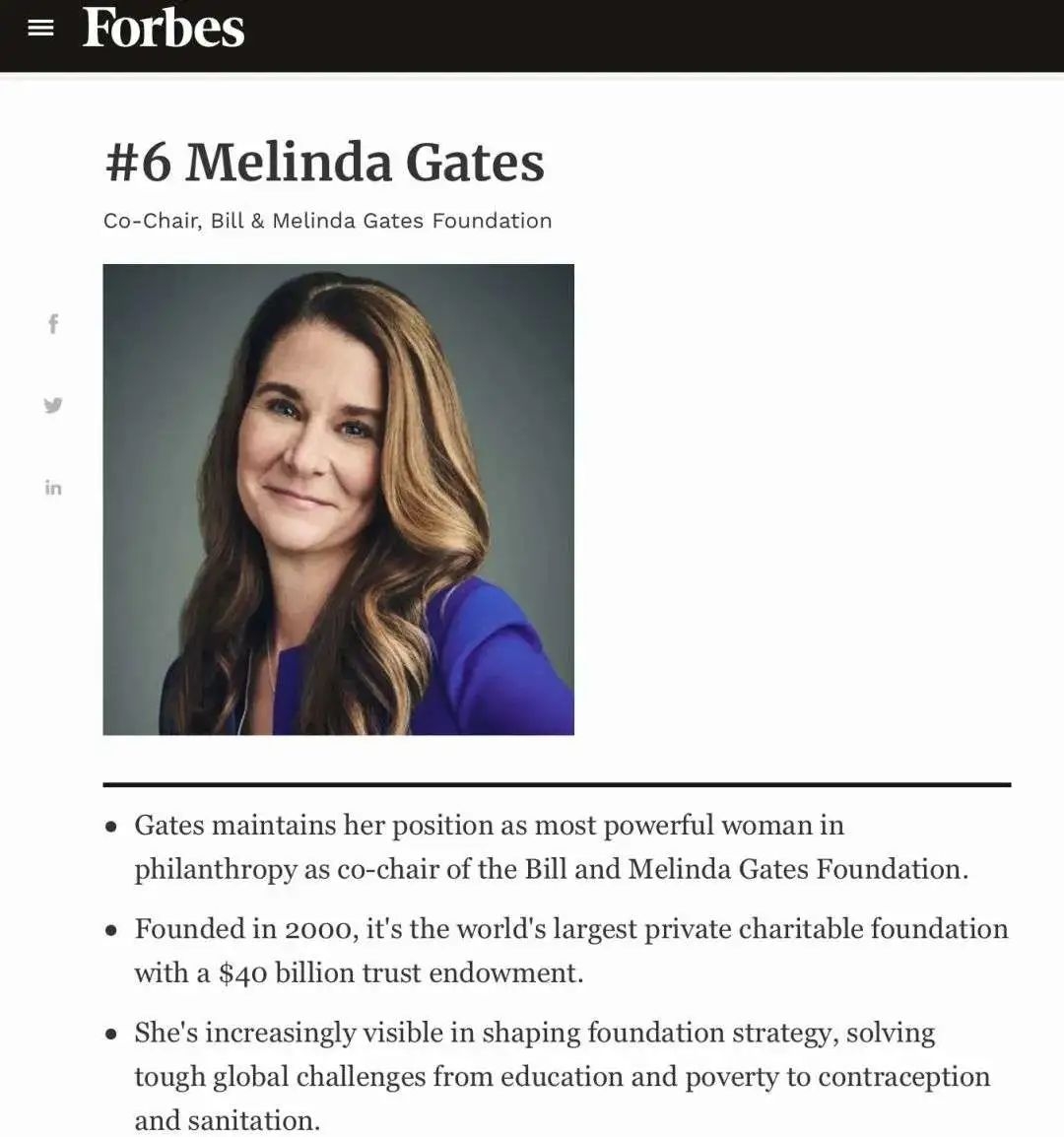 梅琳达曾被《时代周刊》评为年度风云人物,《福布斯》把她列入全球最有权力的女性之一,《华尔街日报》评选她为全球商界女性50强第一名。
