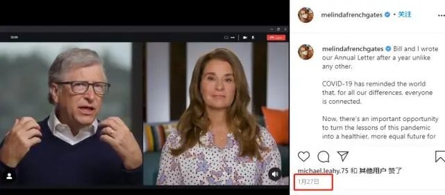 就在今年1月27日,夫妻俩还以视频连线的方式最后一次同框,谈及疫情发生一年以后的生活。梅琳达发布于1月27日,比尔盖茨发布于1月29日。这也是两人官宣离婚之前的最后一次“同框”。