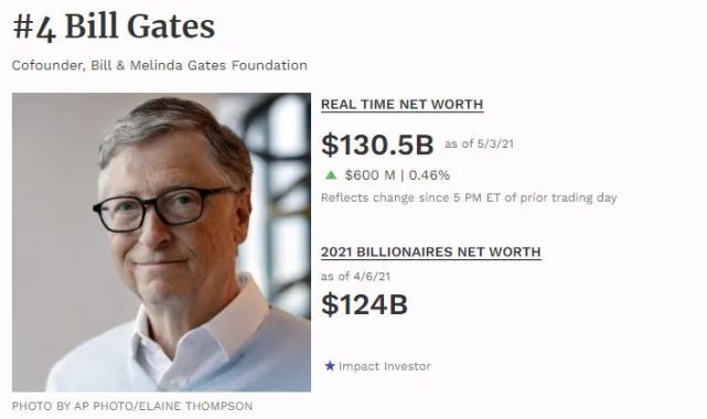 根据福布斯实时富豪榜,截至当地时间5月3日,比尔·盖茨身价达1305亿美元,排名全球第四。仅次于亚马逊(NASDAQ:AMZN)首席执行官杰夫·贝索斯(Jeff Bezos)、路易威登老板伯纳德·阿尔诺(Bernard Arnault)和特斯拉(NASDAQ;TSLA)首席执行官埃隆·马斯克(Elon Musk)。