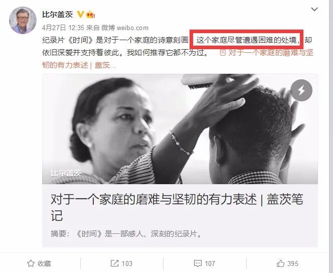 有网友发现,4月27日,比尔·盖茨最新一条博文中似乎暗示了家庭危机,微博大标题是:对于一个家庭的磨难与坚韧的有力表达!其中有这么一句话:这个家庭尽管遭遇困难的处境。