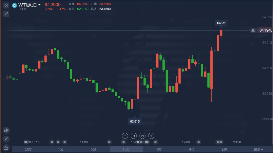 油价也获美指走低支撑,WTI原油期货涨幅扩大至1%,报64.21美元/桶,此前一度跌超1%。