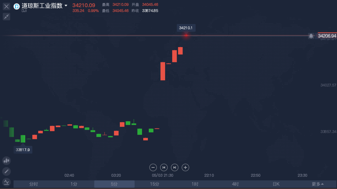 22:00美国4月ISM制造业PMI数据公布后,10年前美债收益率下破1.6%,美指下破91关口,白银继续上拉涨幅扩大至4%,现货黄金逼近1795美元。COMEX最活跃黄金期货合约北京时间5月3日22:00一分钟内买卖盘面瞬间成交2232手,交易合约总价值4亿美元。