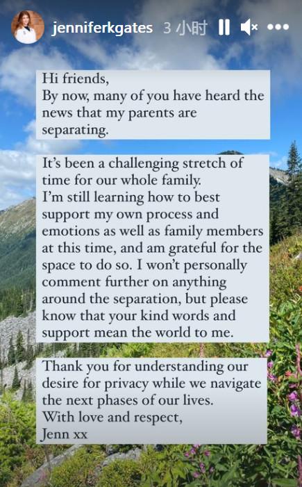 他们的女儿珍妮弗‧盖茨(Jennifer Gates)在Instagram上写道,全家人已历经一段充满挑战的时光。“目前我仍在学习如何以最好的方式,来支持个人的过程和情感,还有自己的家人,我很感激能有空间这么做。”