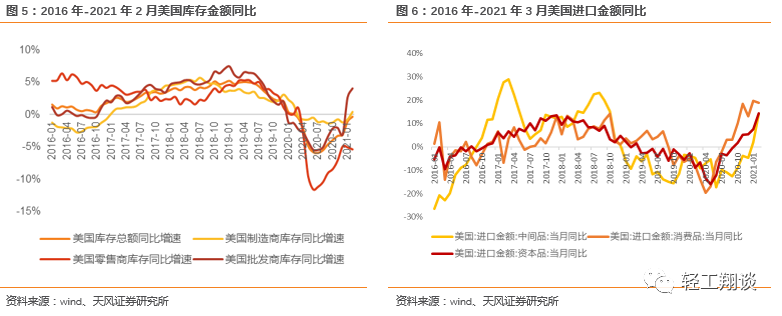 出口集装箱指数同比大幅增加,且超过疫情前同期水平。从中国出口集装箱指数(CCFI)表现看,21年3月CCFI综合指数为1913.60,同比增加112.71%,同比19年3月增加130.33%。美国制造商补库滞后于零售商、批发商,补库方向从消费品到资本品、中间品。21年2月美国库存总额/制造商库存/零售商库存/批发商库存同比+0%/+0%/-5%/+4%,制造商补库滞后于零售商、批发商。21年3月中间品/消费品/资本品进口金额同比+14.2%/+18.81%/+14.42%,补库方向从消费品到资本品、中间品。