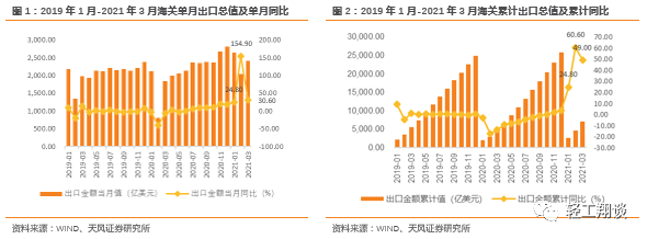 3月及Q1同比均上升,且优于疫情前同期水平。根据海关总署数据,21年3月出口额2411.34亿美元,同比+30.6%,较21年2月的2048.62亿美元增长,且显著优于19年3月1982.34亿美元的出口额,21年Q1出口额7099.78亿美元,同比增加49%,较19Q1增加28.72%,出口景气度持续。