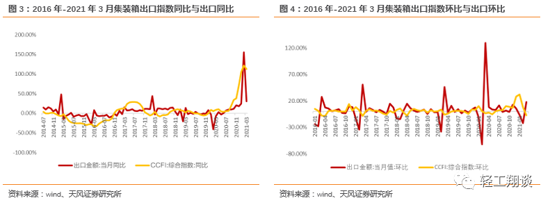 出口集装箱指数同比大幅增加,且超过疫情前同期水平。21年3月出口金额2411.34亿美元,同比上涨30.6%,相比19年3月增加21.64%。Q1出口金额7099.78亿美元,同比增加48.98%,相比19Q1增加28.72%。中国出口集装箱指数(CCFI)对我国出口预测准确,21年3月CCFI综合指数为1913.60,同比增加112.71%,同比19年3月增加130.33%,环比下降7.25%。