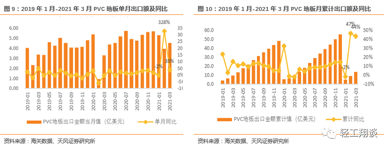 PVC地板出口持续景气,第一季度PVC地板(海关编码39181090)累计实现出口额13.7亿美元,较19年同期增长41.1%。21年3月单月实现出口额4.50亿美元,较21年2月单月出口3.93亿美元有所增长,较19年3月的3.37亿美元提升33.5%。