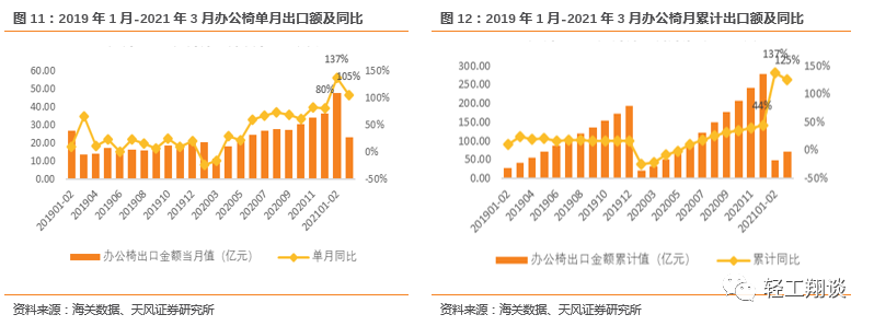 功能办公椅需求高增,Q1办公椅(海关编码940130可调高度的转动坐具)出口额为70.92亿人民币,较19年同期增长75.8%。21年3月单月实现出口额23.22亿元,较21年2月单月出口16.91亿元有所增长,较19年3月的13.61亿元提升70.53%。