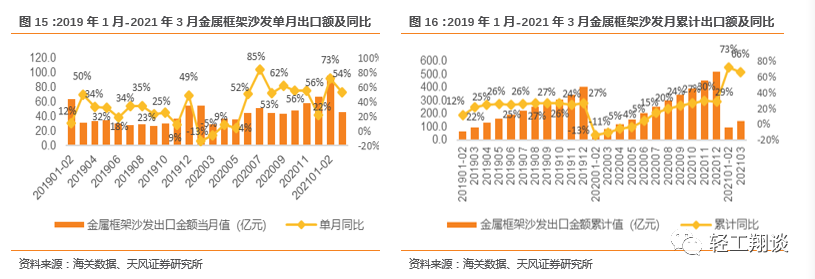 功能沙发等金属框架沙发品类显著增长。2021Q1金属框架沙发(海关编码940171)出口额为142亿人民币,较19年同期95.6亿元的出口额提升48.5%。