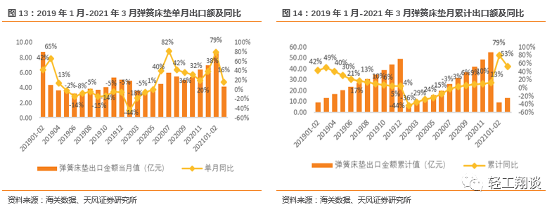 弹簧床垫出口低于疫情前水平。2021年3月弹簧床垫(海关编码940410)出口额为4.10亿元,较19年3月的4.34亿元下降5.45%。累计来看,2021Q1弹簧床垫(海关编码94041000)累计出口额为12.9亿元,与19年同期13.09亿元的出口额下降1.48%。