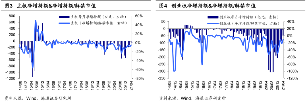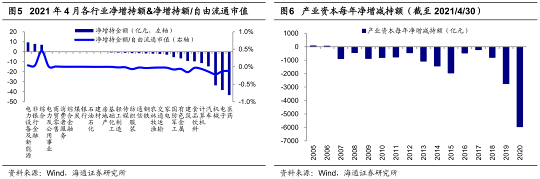 从板块看,创业板减持力度最大。21年4月产业资本在主板净减持76亿元,创业板净减持48亿元,科创板净减持39亿元,净增减持额/解禁市值分别为-5.1%、-11.0%、-9.1%,可见创业板减持力度最大。科创板虽然在2020年7月22日迎来大额解禁,但20年8月-21年4月净减持额月均仅为42亿元左右,原因在于解禁额并不代表产业资本减持额,还要考虑限售股解禁后减持的约束比例及市场行情对产业资本增减持的影响,并且股票从解禁到实际被减持还要经历一段时间。对产业资本每年净减持额进行统计, 20年、19年、18年和17年全年分别为5931、2743、795和223亿元。