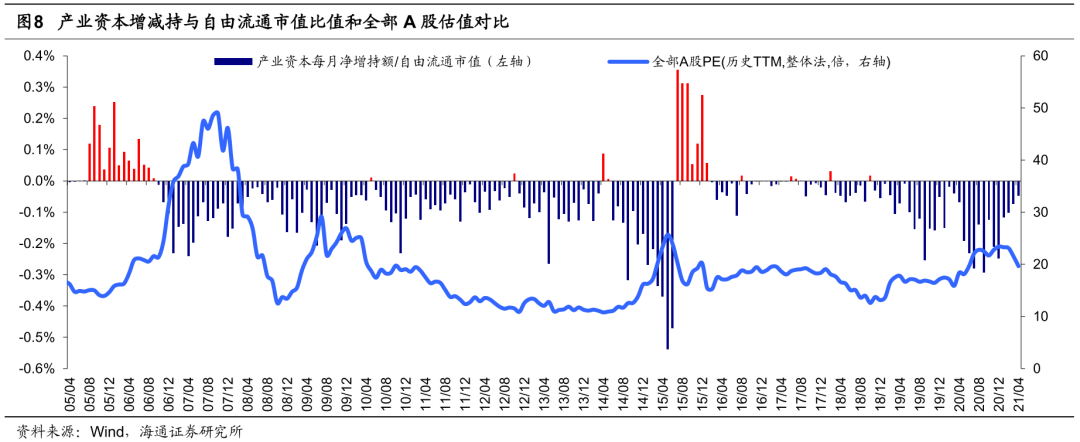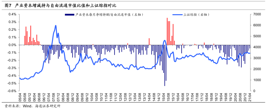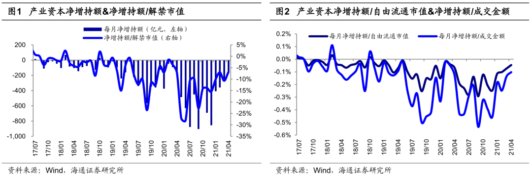 21年4月产业资本二级市场净减持162亿元,21年3月净减持253亿元,17年6月(减持新规实施)以来月均净减持230亿元。2017年5月27日,证监会发布《上市公司股东、董监高减持股份的若干规定》(以下简称减持新规),上交所、深交所也分别发布了相关实施细则,我们研究减持新规实施以来的增减持情况:截止2021年4月30日,从绝对规模看,21年4月产业资本二级市场净减持162亿元,而21年3月净减持253亿元,2017年6月以来产业资本月均净减持230亿元。从相对规模看,21年4月产业资本净增减持额/解禁市值为-6.9%,2017年6月以来均值为-7.3%;净增减持额/自由流通市值为-0.05%,2017年6月以来均值为-0.09%。