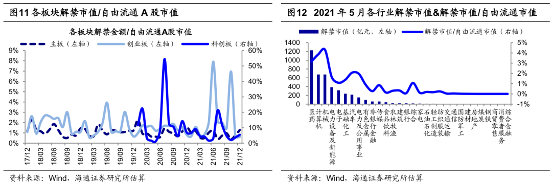 21年5月A股解禁市值约为4275亿元,高于21年4月的2357亿元,21年月均解禁4304亿元。我们按照2021/4/30的股价估算,21年月均解禁4304亿元,20年月均3862亿元。21年5月解禁市值/自由流通A股市值为1.2%,2017年以来该比值均值为1.2%;21年5月解禁市值/成交金额为2.7%,2017年以来该比值均值为2.7%,从自由流通市值角度21年5月解禁相对规模与2017年以来平均水平基本持平。从板块看,21年5月主板、创业板、科创板解禁金额分别为3027、1084、164亿元,解禁金额/自由流通A股市值分别为1.0%、2.1%、1.7%,可见创业板解禁的相对规模最大。对全部A股每年解禁市值进行统计, 21年/20年/19年/18年全部A股解禁市值分别为51650亿元、46348亿元、31510亿元和31376亿元。