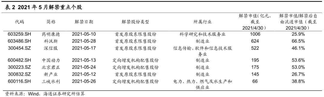 21年5月医药、计算机、机械等行业解禁金额最大。按照21年4月30日的股价估算:5月医药、计算机、机械等行业解禁金额最大,解禁金额分别为1224、679、675亿元。从解禁市值/自由流通市值角度看,5月机械、计算机、医药等行业解禁相对规模最大,解禁市值/自由流通市值分别为4.3%、3.9%、3.2%。从个股来看,21年5月药明康德、科沃斯解禁规模最大,解禁金额分别为1006、624亿元,解禁市值/自由流通市值分别为25.9%、66.5%。