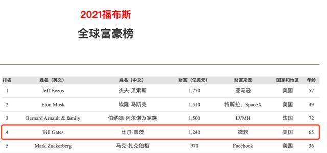 除了离婚事件本身之外,盖茨拥有的巨大财富也再次受到关注。据福布斯编制的2021年全球富豪榜,现年65岁的盖茨身价1240亿美元,约合人民币8045亿元,排在亚马逊创始人贝佐斯、特斯拉创始人马斯克和LVMH老板伯纳德·阿尔诺及家族之后。